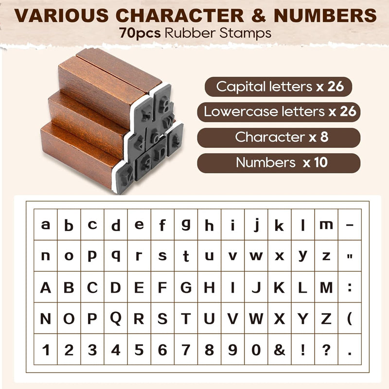 - Vollständiger Satz von Buchstabenstempeln:: Enthält 26 Großbuchstaben und häufig verwendete Zahlen und Satzzeichen, um alle Ihre Anforderungen an Textkombinationen zu erfüllen.
